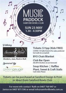 Samford Bowls Club is hosting a MUSIC IN THE PADDOCK event featuring the fabulous Second Wind Community Band on Sunday 23rd May 2021.