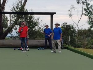 On Thursday the Samford Drifters — Rod Palmer, Ken Heiniger, David Taylor played the Samford Hillbillies — Mac Patterson, Ray Davis, Anne Bredhauer and Janet Patterson on the green at Mac and Janet’s place.
